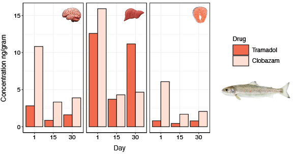 Preliminary data showing the bioaccumulation (ng/g) of tramadol and clobazam in the brain, liver and muscle tissue of two year-old salmon smolt over a 30 day period. To put these results into perspective, concentrations less than 1ng/g have been shown to compromise ecologically important behaviours in fish.