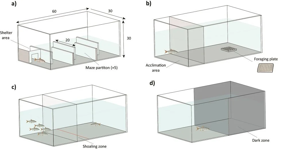 Following the exposure treatment, fish will be measured for a suite of behavioural traits that are fundamentally important for survival, including activity, foraging behaviour, social behaviour and risk-taking behaviour. I will measure these behavioural traits in each fish three times (each test will be at least three days apart). This repeated testing approach will allow me to estimate consistent among-individual variability in these behaviours. All video trials will be video recorded and analysed using neural network maching learning (i.e. Mask R-CNN) for automated behavioural tracking in collaboration with Dr Alex Jordan at the Max Planck Institute of Animal Behaviour (MPI) in Konstanz, Germany. This approach will allow me to characterise generalisble and reproducible behaviours in fish, that I can then extrapolate and compare to behaviours seen in more natural conditions (see work packages 3 and 4)